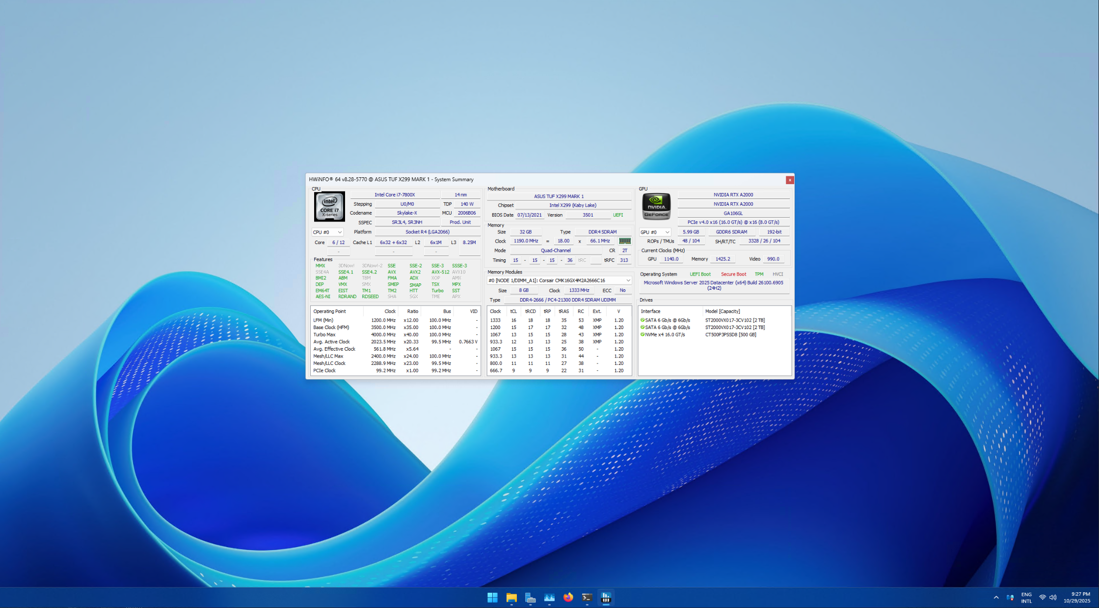 Before the upgrade I used my very first server plattform for this. An odd chinese "X99" Board with some 6 core Broadwell Xeon, 32GB of ECC DDR4 memory and an nVidia GT 710 as a pixel picasso. It worked fine for Windows Server 2025 and some lighter game servers (even those struggled at times), but that was about it.